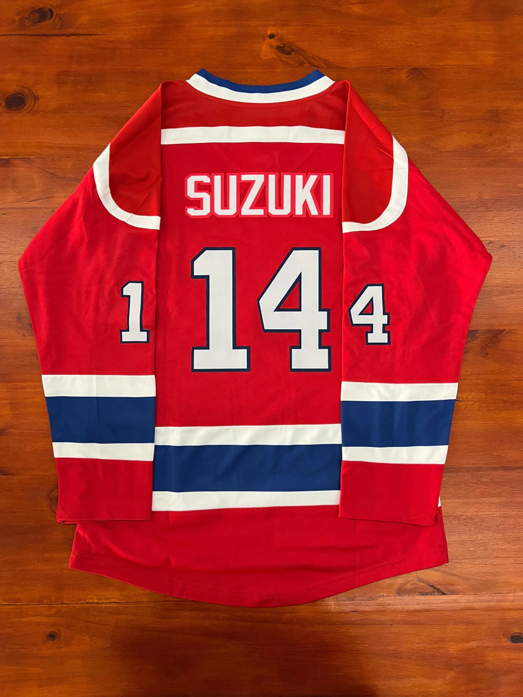 Réplica moderna de los Canadiens de Montreal, equipo histórico de la NHL. Esta camiseta roja con detalles en blanco y azul refleja la estética clásica del club. Lleva el número 14 y el nombre "Suzuki", jugador actual y capitán de la franquicia. Está confeccionada con materiales de primera, logrando un producto fiel y duradero.