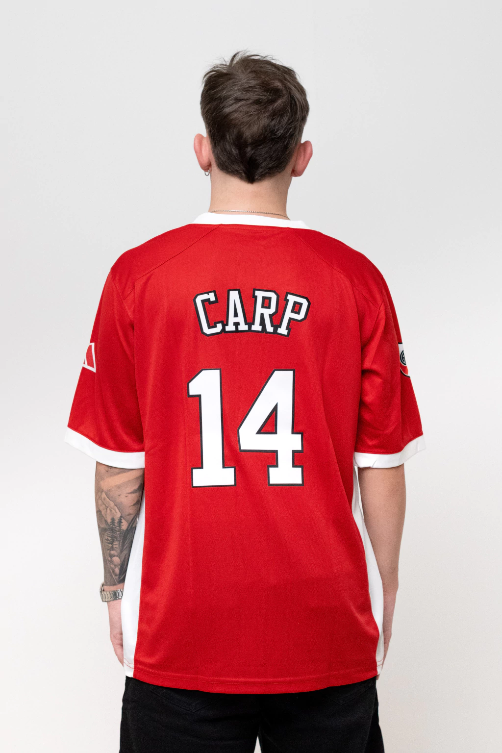 Camiseta edición especial NFL inspirada en River Plate. Diseño bicolor rojo y blanco con detalles en los hombros y mangas, número 14 en el frente y la espalda con la leyenda